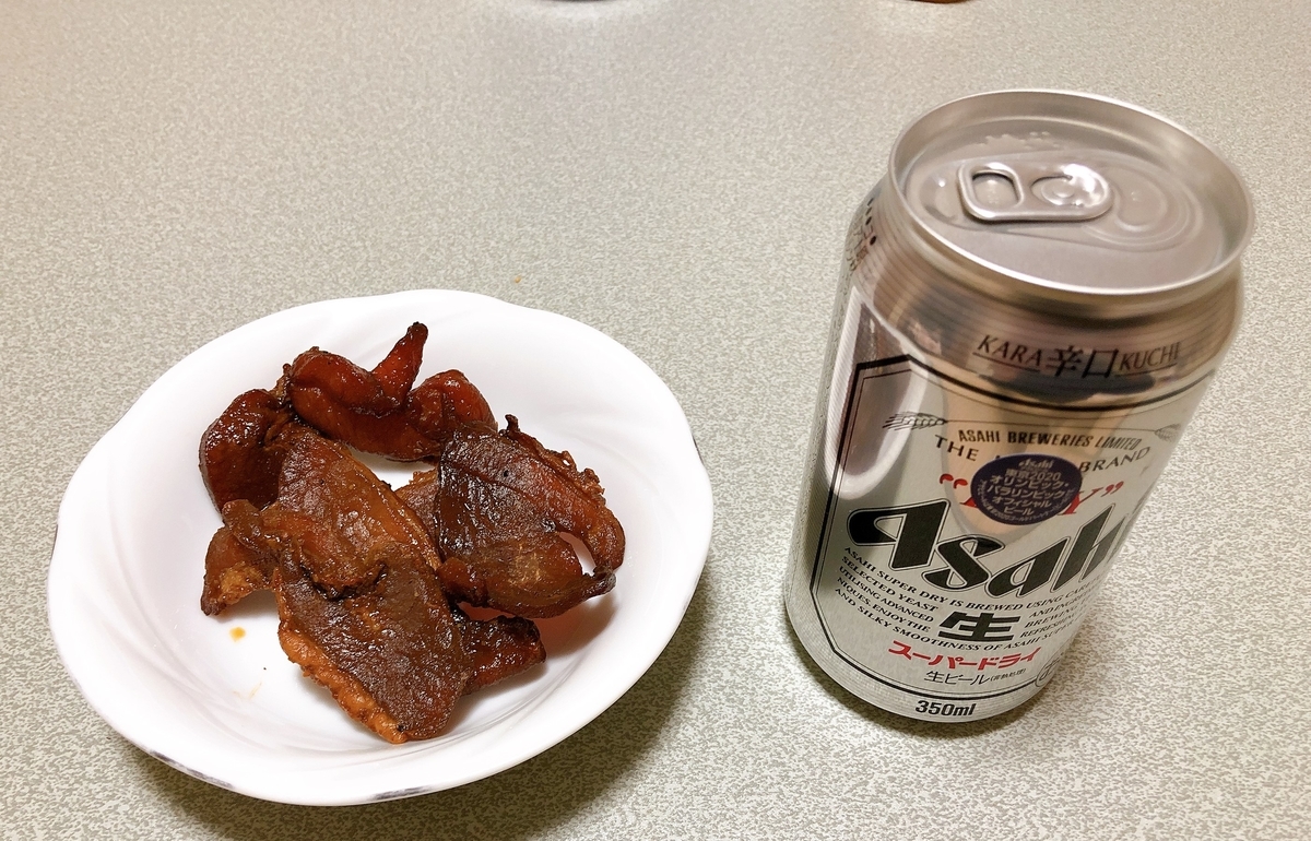 市販品と比べると、食感などは違いますが、立派なビーフジャーキーができました!出来上がったビーフジャーキーでビールがすすむ~。市販品よりも味が濃い目でしっとりとしていて美味しいですよ~。