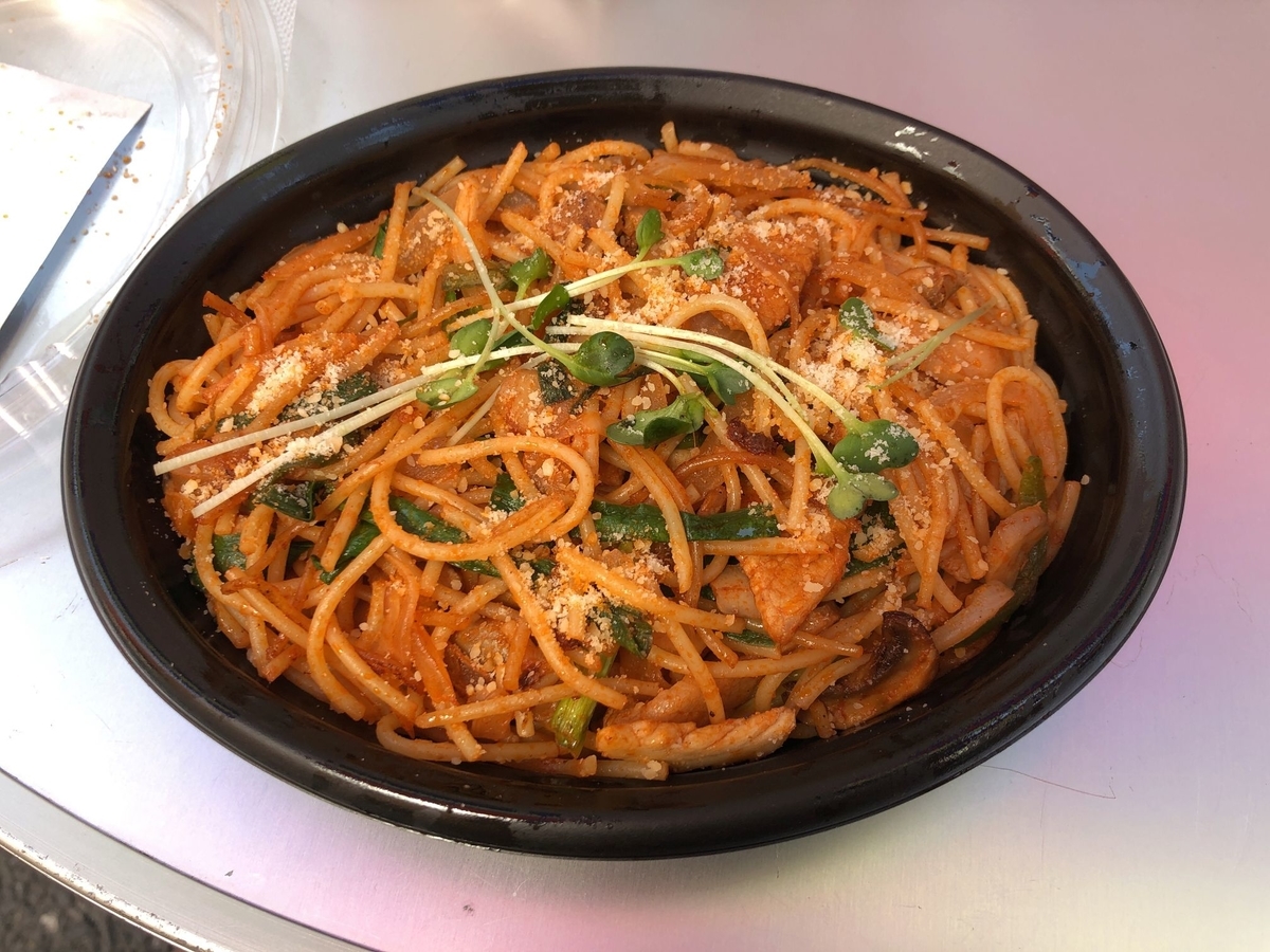 たまたま駅前の通りでお祭りをやっていて、そこで売っていた伯爵邸のナポリタン(屋台ver.)を食べました。